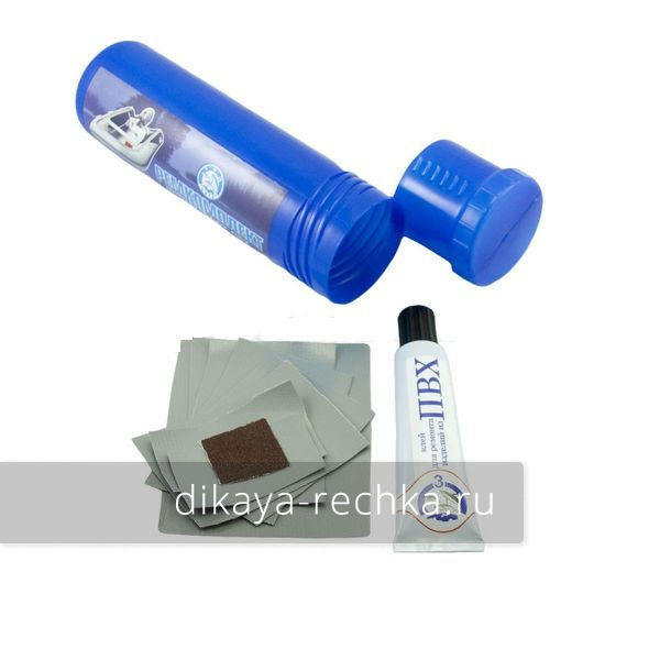 Ремкомплект для лодок ПВХ, состоящий из тюбика качественного полиуретанового клея и набора заплаток из ПВХ ткани. Перед заклеиванием поверхности нужно обезжирить ацетоном или спиртосодержащей жидкостью либо обработать наждачной бумагой. Нанести клей в два слоя на обе поверхности с промежуточной сушкой 10-15 минут, нагреть заплатку и и место склеивания до 70-100 градусов, приложить друг к другу и прокатать круглым твёрдым предметом. Через 2 часа изделием можно пользоваться, полностью клей высохнет через 12 часов.