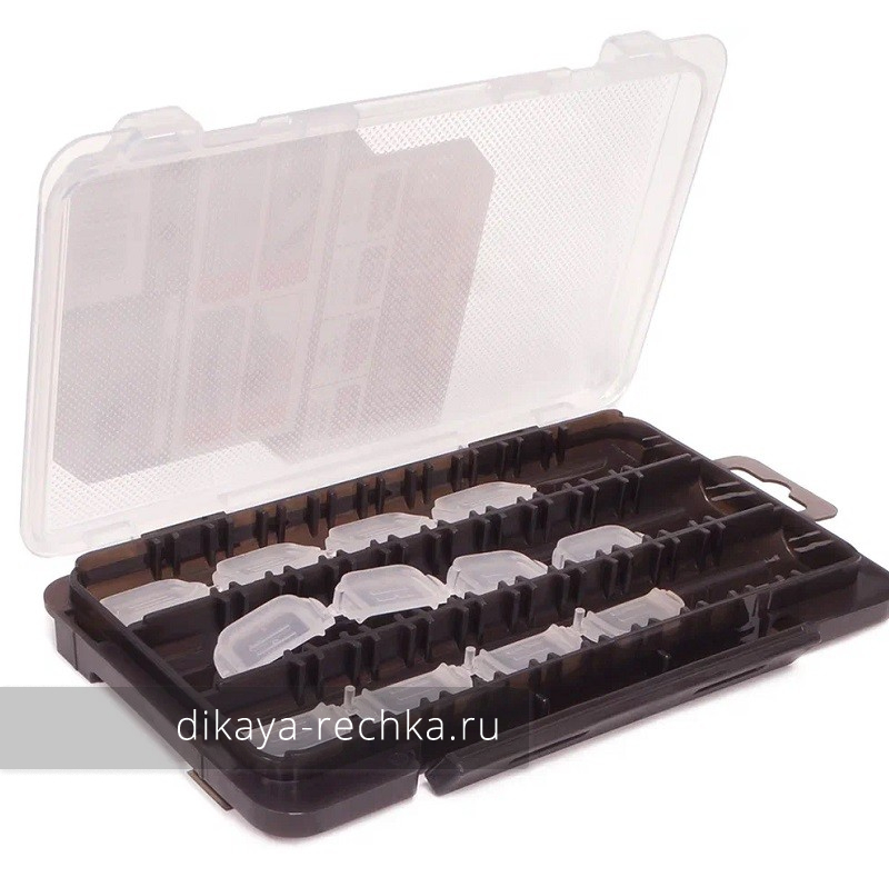 Небольшая карманная коробочка очень популярной у микроджигеров формы. Ребристая внутренняя поверхность крышки не дает приманкам прилипать. Съемные разделители позволяют удобно организовать пространство, и приманки всегда в легком доступе. На обратной стороне есть крепления, позволяющие соединить две коробки между собой.