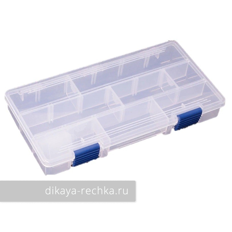 Прозрачная коробка для рыболовных принадлежностей из прочного пластика. Три продольных отсека имеют пазы для съемных перегородок, и вы можете адаптировать размер ячеек под ваши приманки. Небольшая глубина коробки удобна для быстрого выбора нужной приманки.