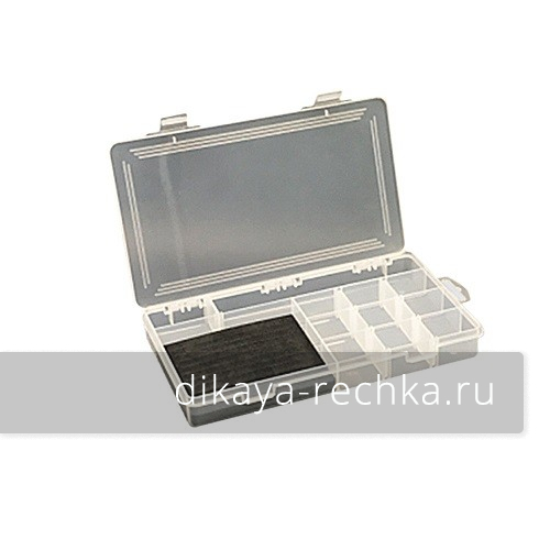 Прозрачная комбинированная коробочка, внутри которой есть длинный отсек под мотовила/поплавки, три отсека со съемными разделителями под грузила или другие рыболовные мелочи, и вкладыш из плотной пенки с прорезями, в которой удобно хранить приманки или джиг-головки.