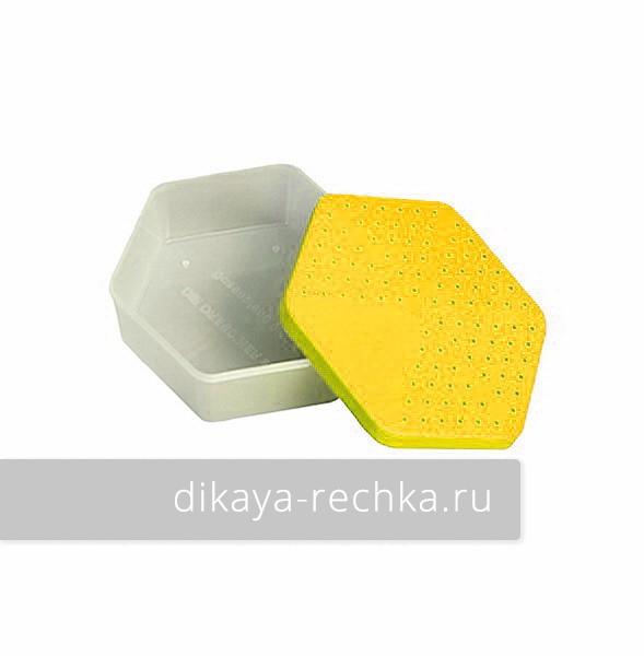 Шестиугольная коробочка под наживку с плотно закрывающейся перфорированной крышкой.