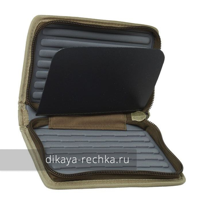 Двусторонний чехол-кошелёк на молнии для хранения блёсен и некрупных воблеров. Крючки приманок втыкаются в мягкую подложку для надёжной фиксации. Чтобы приманки не цеплялись друг за друга, внутри предусмотрена жёсткая перегородка.