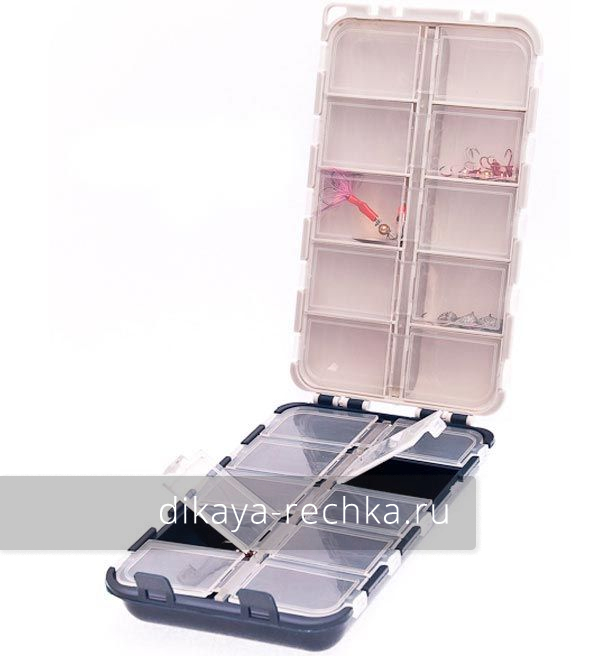 Пологие ячейки с крышками подходят для хранения крючков, вертлюжков, мелких джиг-головок, чебурашек, микросиликона.