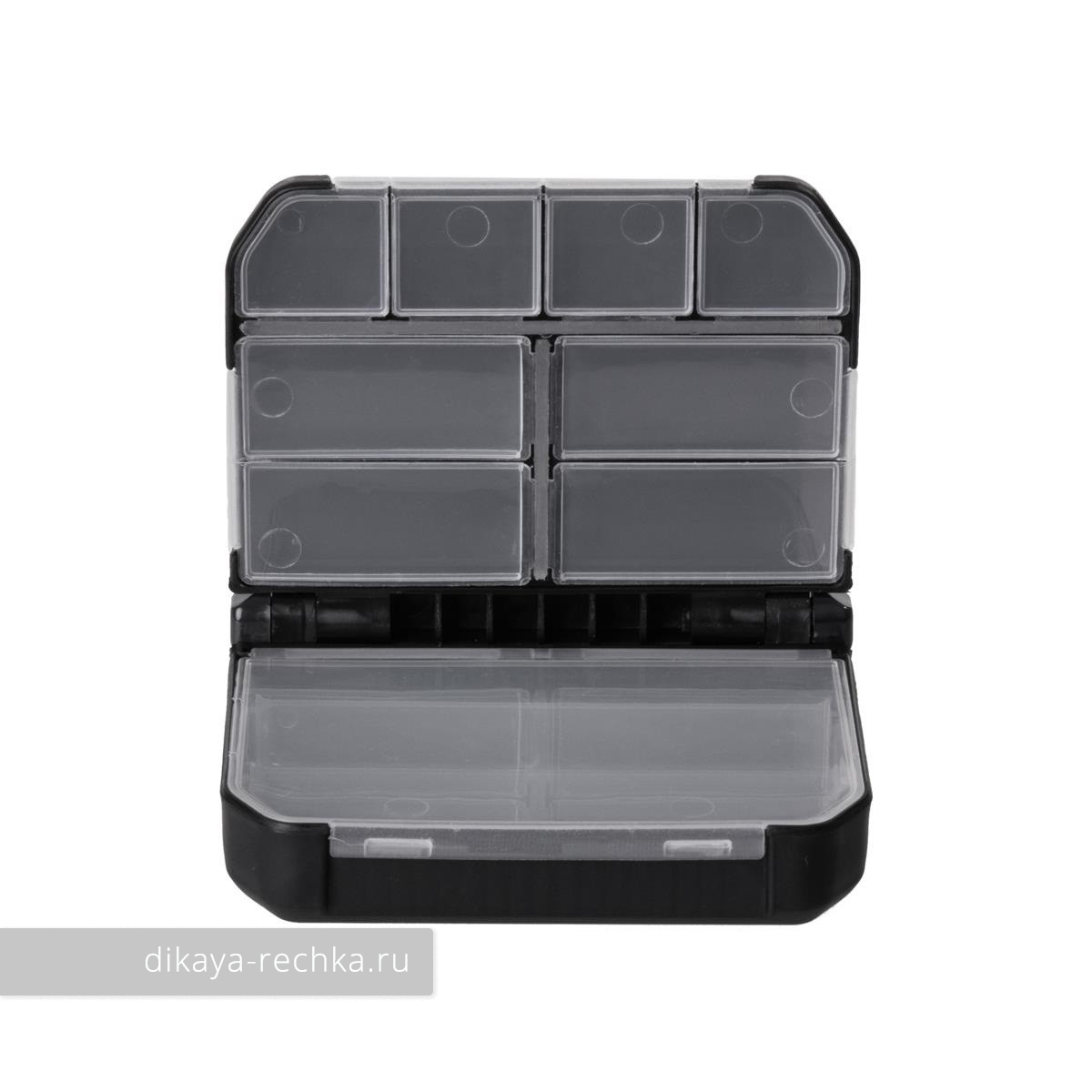 Пластиковая коробка для рыболовных мелочей, в которой с одной стороны большой отсек со съемными разделителями, а с другой - восемь отсеков с отдельными крышками.
