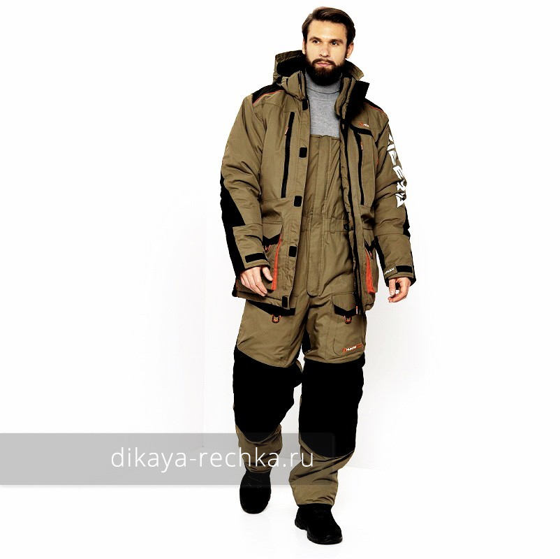 Эргономичный тёплый костюм для зимней рыбалки, охоты и отдыха на природе в самые лютые морозы. Верх его изготовлен из мембранной ткани, которая "дышит", не пропуская влагу внутрь, но при этом отводя её наружу, если вы вспотеете во время физической активности. Куртка с удобным регулируемым капюшоном и полукомбинезон утеплены фирменным материалом Сиберия, очень лёгким, но отлично сохраняющим тепло. Для ещё большего комфорта и "тёплого" ощущения при носке подклад куртки и верхней части штанов выполнен из флиса. На куртке и на полукомбинезоне есть множество различных карманов, расположение которых тщательно продумано. Контрастные светоотражающие вставки не только улучшают внешний вид костюма, но и повышают вашу безопасность в тёмное время суток, ведь их отлично видно в свете фар. Наружные карманы закрываются либо на влагозащитную молнию, либо снабжены клапаном, предохраняющим их от попадания снега внутрь. И куртка, и штаны застёгиваются на двойную пластиковую молнию крупного размера, снабжённую ветрозащитным клапаном на липучке. Штаны снабжены регулируемыми лямками с качественными застёжками типа "фастекс", утягиваются вшитой в пояс резинкой, на них есть петли для вдевания поясного ремня. Колени и седалищная часть снабжены защитными вставками из мягкого вспененного материала.