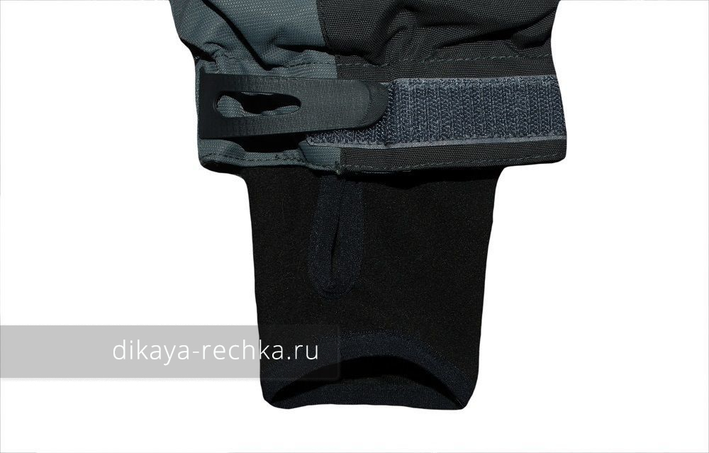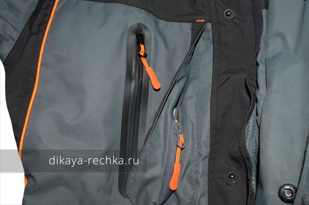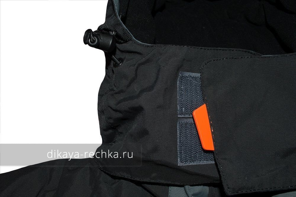 И куртка, и штаны застёгиваются на двойную пластиковую молнию крупного размера, снабжённую ветрозащитными клапанами на кнопаках. Полукомбинезон на регулируемых лямках имеет завышенную поясничную часть, на куртке от поддувания предусмотрена утягивающаяся кулиска. Высокий воротник и отстегивающийся регулируемый по объему капюшон дают возможность закрыться от ветра и холода по максимуму.