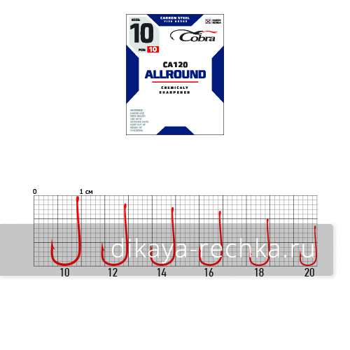 Cobra ALLROUND сер. CA120 - серия острых крючков из тонкой проволоки. Они подходят для деликатной летней и зимней ловли. Эти крючки - лучший выбор для зимней ловли леща и других карповых на поплавочную удочку, ведь благодаря тому, что они очень тонкие, на них легко насаживать мотыля, не опасаясь, что он вытечет. Красный цвет крючка не выделяется на фоне наживки, и даже самый осторожный лещ не заподозрит подвоха. Также их можно использовать в зимней ловле окуня вместо мухи, привязываемой выше мормышки. В наших условиях красные крючки с надетой на них жёлтой или оранжевой бусинкой широко применяются для ловли хариуса на Ангаре.
