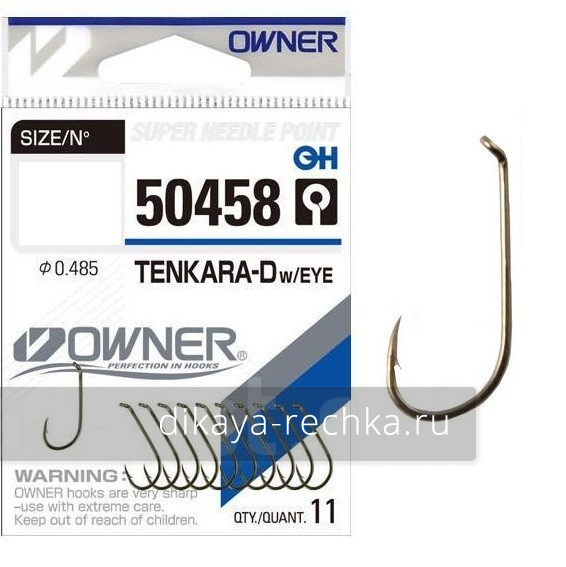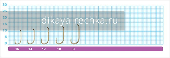 Прямой крючок с отогнутым внутрь ушком и широким загибом, изготовлен из проволоки средней толщины.