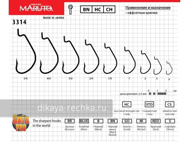 Высококачественный офсетный крючок от японской компании Maruto с широким загибом типа Wide Gap. Его удлинённое острое жало при подсечке глубоко впивается в пасть хищника, не давая ему сойти при вываживании, этому способствует широкий загиб, действующий, как рычаг. Крючок изготовлен из качественной стальной проволоки, прочной, но не хрупкой. Его весьма сложно сломать или разогнуть. Благодаря специальному покрытию мало подвержен коррозии. Такие крючки можно применять для приманок любого типа, даже тех, которые изготовлены из жёсткого материала. Исключение составляют только виброхвосты с узким высоким телом, их лучше оснащать джиг-головками.