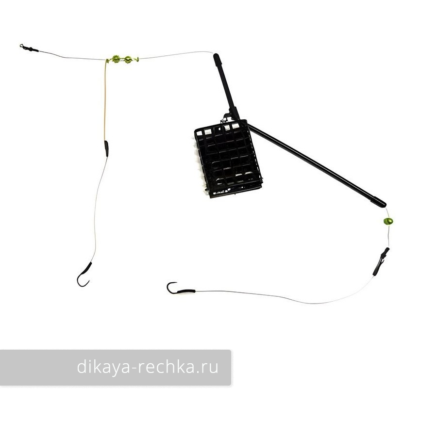 Монтаж для донной удочки, состоящий из металлической сетчатой кормушки весом 40 граммов с трубкой-противозакручивателем для исключения захлёста за леску, надетой на плетёный шнур, и двух крючков №8 на коротких поводках. Снабжён вертлюгом для привязывания к основной леске.