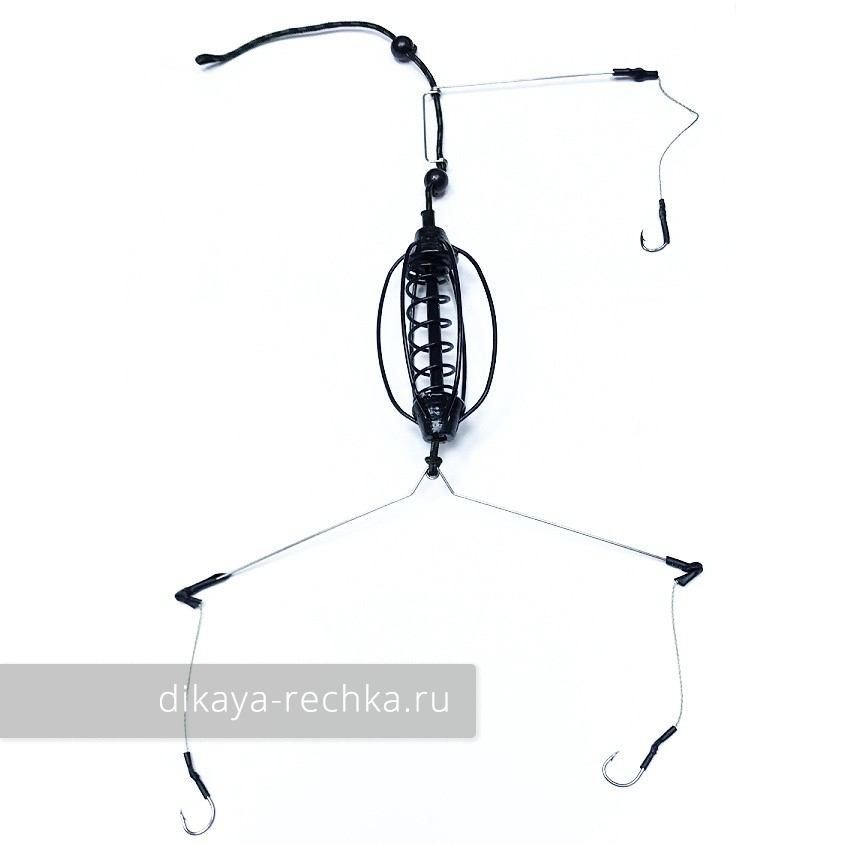 Монтаж для донной удочки, состоящий из пружинной кормушки весом 35 грамм, закрепленной на лидкоре, поводка с крючком на антизакручивателе и коромысла с двумя крючками на коротких поводках.