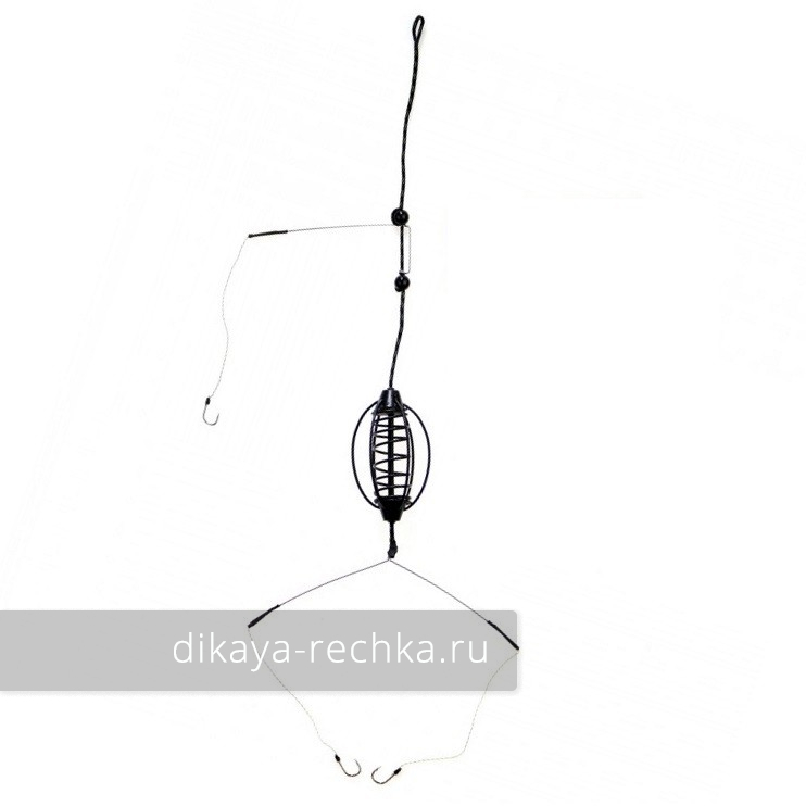 Монтаж для донной удочки, состоящий из пружинной кормушки весом 25 грамм, отводного поводка выше кормушки и коромысла с двумя крючками №8 на коротких поводках.
