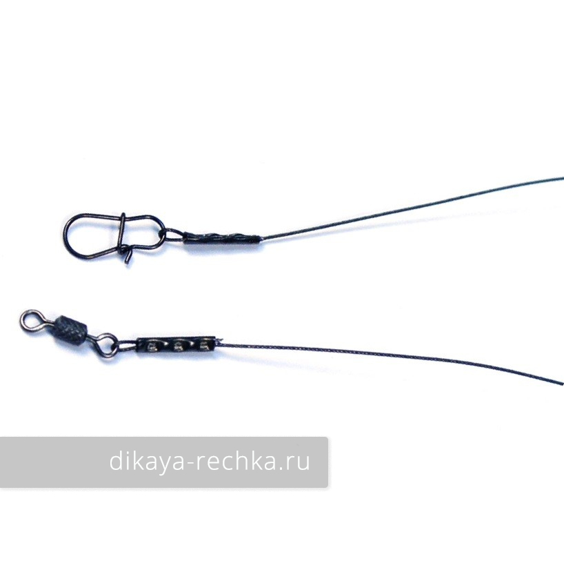 Гибкий поводок из многожильного стального тросика, оснащённый вертлюгами и карабином. Подходит для ловли спиннингом крупной хищной рыбы.