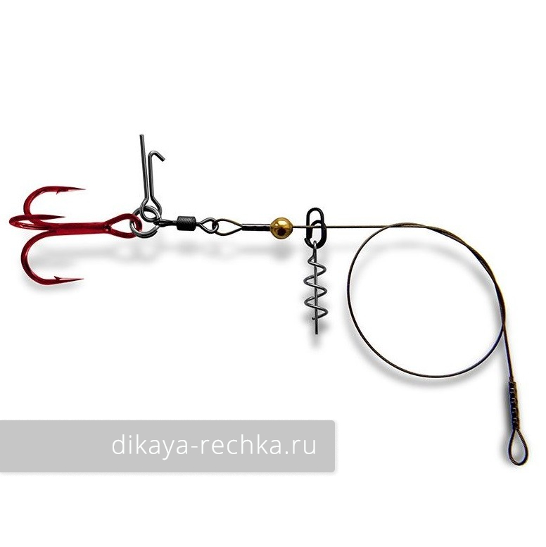 Стингер с красным мощным тройником на металлическом поводке. Для крепления к силиконовой приманке предусмотрена промежуточная спираль и шпилька у тройника.