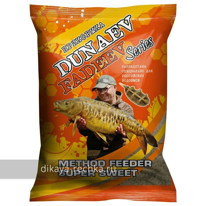 "DUNAEV-FADEEV" Feeder Method Super Sweet - очень насыщенная по ароматике прикормка, произведенная с использованием оригинальной сладкой формулы авторства Алексея Фадеева, известного российского рыболова, который специализируется на ловле мирной рыбы на фидер и донные оснастки. Мелкодиперсная желтая смесь с очень сложным составом имеет в своей основе смесь зерновых и рыбную муку. Хотя эта прикормка в первую очередь предназначена для ловли методными и флэт-методными кормушками, она подойдёт и для ловли обычным фидером. Ориентирована на прудовую и озерную ловлю карпа и сазана по теплой воде в условиях сильного рыболовного прессинга.