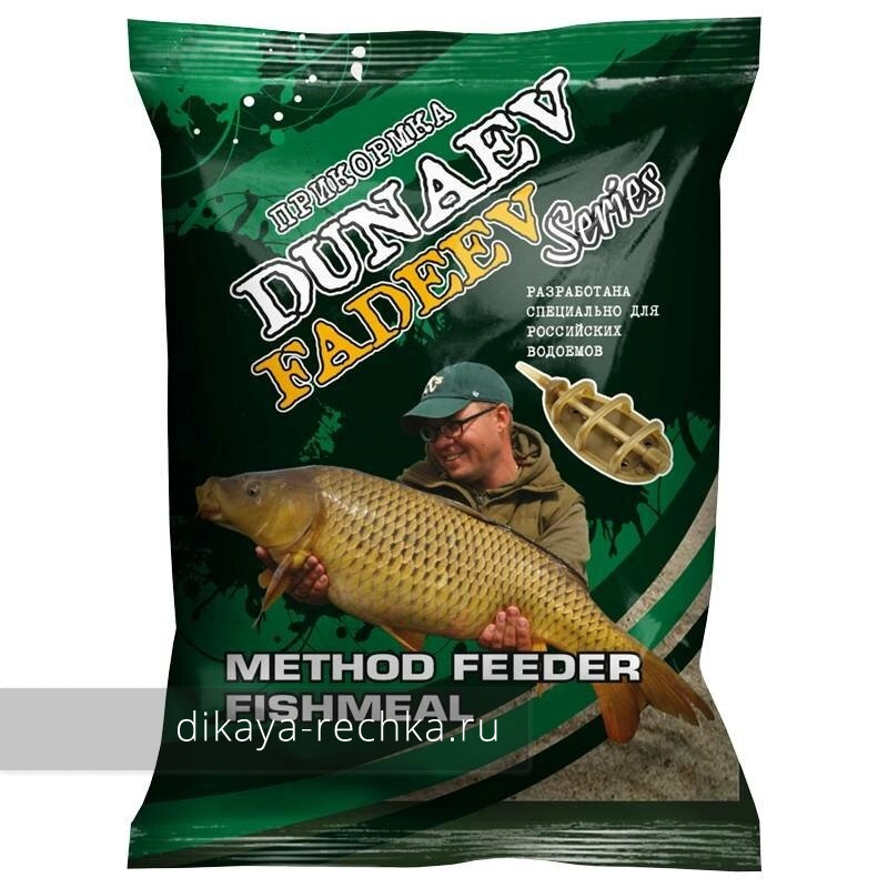 "DUNAEV-FADEEV" Method Feeder Fishmeal - прикормка оригинальной рецептуры Алексея Фадеева, известного российского рыболова, который специализируется на ловле мирной рыбы на фидер и донные оснастки. Эта высокопитательная прикормка темно-коричневого цвета с очень сложным составом имеет в своей основе смесь зерновых и рыбную муку. Хотя эта прикормка в первую очередь предназначена для ловли методными и флэт-методными кормушками, она подойдёт и для ловли обычным фидером. Ее можно добавлять в другие прикормки, ориентированные на другие виды белой рыбы. Будьте уверены - если поблизости есть карась, лещ или сазан, он обязательно отдаст должное вашей прикормке. Благодаря малой активности и высокой вязкости применима и на течении, и в холодной воде.