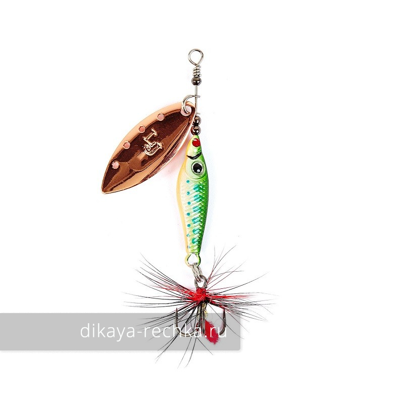 Trian Blade Long - вращающаяся блесна от компании Lucky John с лепестком формы "ивовый лист" и сердечником в форме рыбки, предназначенная для ловли в средних и глубоких слоях воды. Угол раскрытия небольшой, поэтому приманка обладает хорошими полетными характеристиками, не слишком упориста при проводке и быстро погружается на нужную глубину. Малый вес латунного лепестка и подвижное крепление-коромысло способствуют тому, что блесна заводится сразу при попадании в воду и работает даже на медленной скорости, а отверстия по наружному краю создают дополнительные акустические колебания, воздействующие на чувствительную боковую линию рыбы. Яркая мушка на остром тройнике добавляет приманке привлекательности.