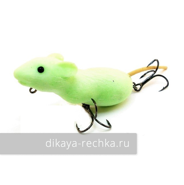 Плавающая имитация мыши для ночной рыбалки. Люминесцентное покрытие дает возможность видеть, где находится приманка, в то время, как рыба, смотрящая на нее в контрсвете, воспринимает объект больше как силуэт и звуковой раздражитель, за что отвечают постукивающие шарики в шумовой камере. Выполнена из пенополистирола на подгруженном каркасе из нержавеющей стали и оснащена двумя острыми тройниками.