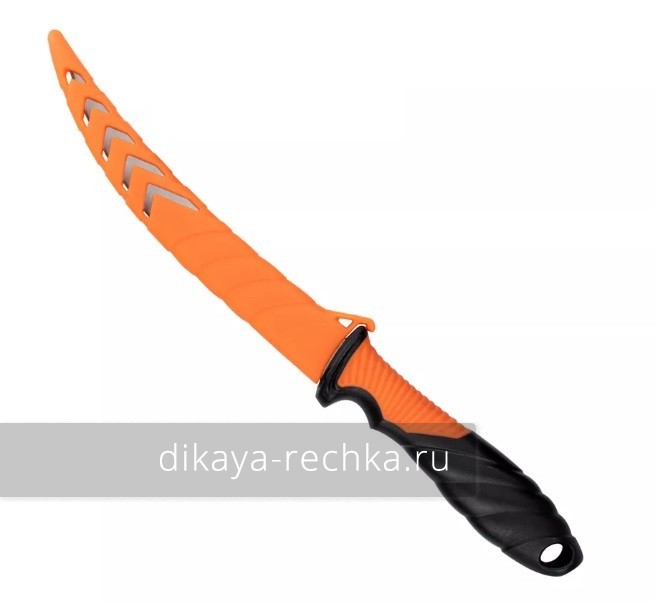 Рыболовный филейный нож с гибким лезвием из нержавеющей стали и пластиковым чехлом.