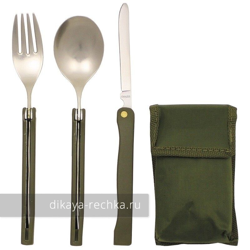 Компактный набор туристических приборов из нержавеющей стали. В сложенном состоянии занимают совсем немного места, помещаясь с кружку или миску.