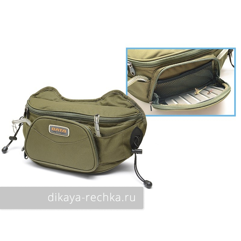 Компактная поясная легкая сумка защитного цвета имеет очень продуманную конструкцию - помимо основного отсека с сетчатыми кармашками, в ней есть наружный карман с пенкой для хранения приманок, вытяжные шнуры для крепления инструмента и система "свободные руки" для спиннинга. Регулируемый по длине ремень может полностью сниматься - при желании сумку можно повесить на шею, закрепить к рюкзаку или на обычный брючный ремень с помощью лямок с карабинами. Обратная сторона уплотнена мягкой сетчатой тканью для комфортного ношения.