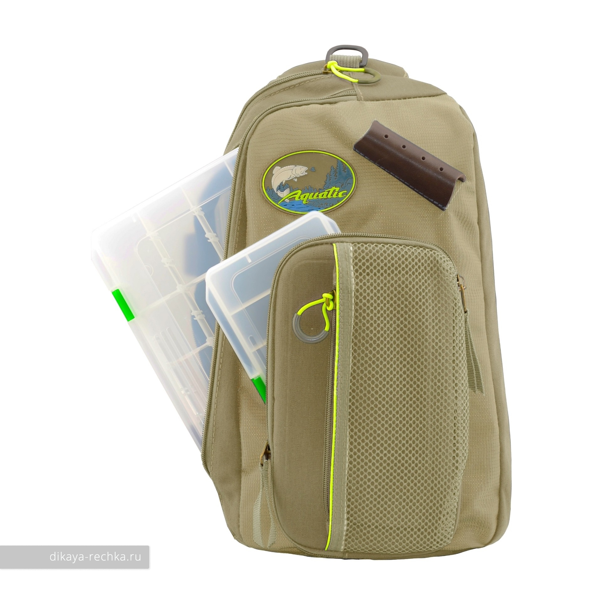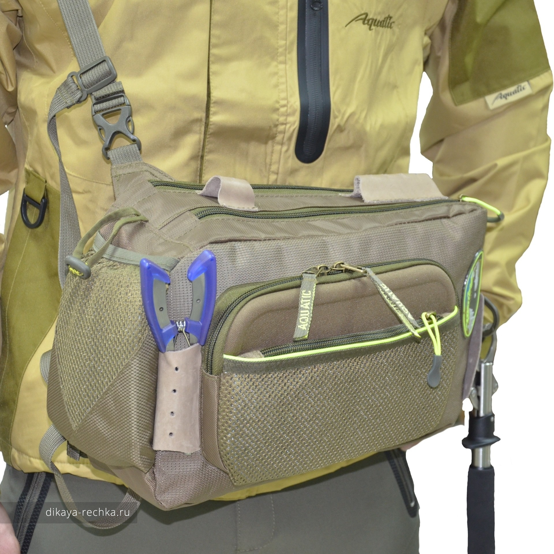 Многофункциональная вместительная сумка-слинг с продуманной системой доступа к содержимому подойдет для ходовой рыбалки, в том числе и забродной.