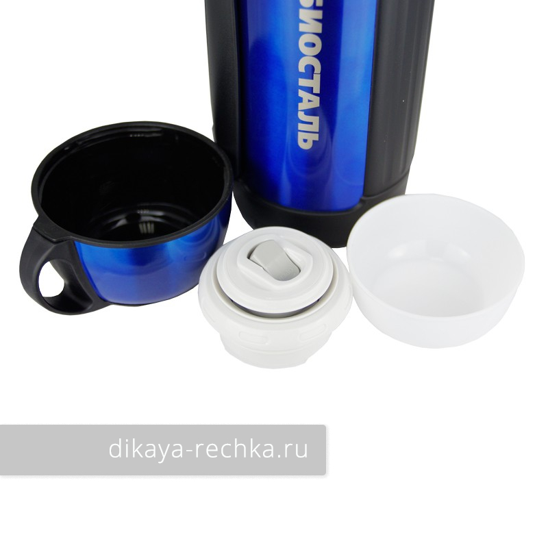 Термос с колбой и корпусом из нержавеющей стали с двумя чашками. Закручивающаяся крышка оснащена кнопкой, которую можно открыть одной рукой. Складывающаяся ручка и дополнительные пластиковые накладки на корпусе выступают в роли граней, не дающих термосу кататься по салону или багажнику машины. Термос сохраняет температуру как холодных, так и горячих напитков в течение длительного времени, а широкое горло позволяет использовать его и как суповой.