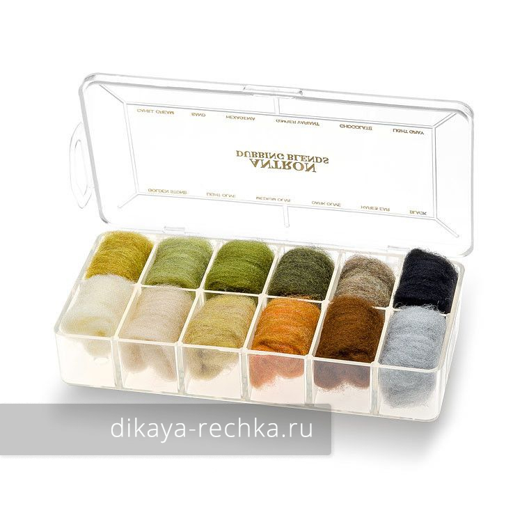 Набор даббинга 12 различных цветов, изготовленного из синтетического волокна Antron от компании DuPont. Это тонкое волокно очень послушно в работе, и может быть использовано как самостоятельно, так и в смеси с другими материалами. Оно придаёт мушкам привлекательную игру и блеск, из него делают очень тела уловистых имитаций бокоплавов (бормаш), нимф; так как антрон не впитывает воду, из него получаются отличные сухие мушки. Это волокно очень долговечно, стойко к износу, практически не стареет и не меняет цвет.