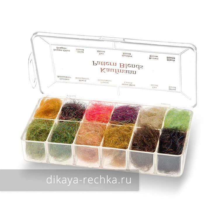 Набор из даббингов WAPSI SLF Kaufmann's Dubbing из 12 различных цветов, упакованных в прозрачную коробочку с крышкой. Эту смесь создал известный во всем мире вязальщик мушек Randall Kaufmann. Придумана она им для своих имитаций нимф и крупных имаго веснянок и ручейников, в частности всем известны его силуэтные имитации веснянок Kaufmann's Stonefly. Даббинги представляют собой сочетание блестящей синтетики и натуральных волокон в определенных пропорциях для создания нужной жесткости, текстуры и оттенка. Состав смеси не разглашается, но всегда воспроизводится со стопроцентной точностью в каждой партии.