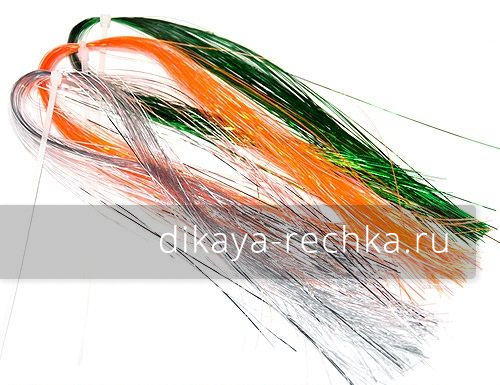 FLY-FISHING Flashabou 1/69" – блестящие синтетические волокна, используются как добавка в крыло стримеров и разнообразных лососевых мушек. На более мелких крючках их также используют для формирования тел мушек, их сегментации, хвостиков.