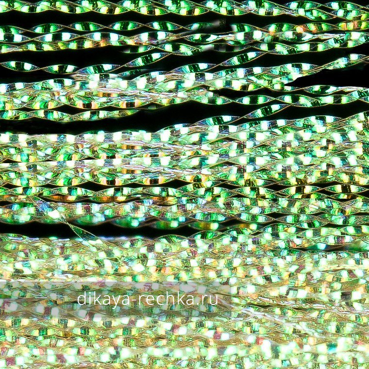 Тонкое блестящее синтетическое волокно с голографическим эффектом, предназначенное для изготовления лососевых мушек и стримеров. В наших условиях применяется для изготовления ножек, крылышек, как риббинг или подмотка, обладающие повышенной привлекательностью для рыбы.