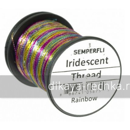 Semperfli Овальный люрекс Iridescent Thread RAINBOW - тонкий овальный люрекс с плавными переходами цветов, который не тускнеет со временем благодаря предварительной лакировке. Сам он изготовлен их металлизированной плоской пленки, а внутри него находится прочный монокорд из полиэстра, который нужен для того, чтобы люрекс не рвался при работе. Люрекс используется для сегментации тел всех видов мушек, намотки тел и создания акцентов.