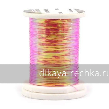 Плоский полупрозрачный люрекс с опаловым отливом, дающим переливающийся эффект в зависимости от угла падения света.