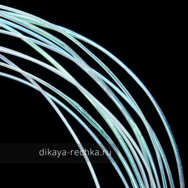 Материал - монолитный, круглого сечения, очень тонкий, чуть эластичный, с перламутровым отсветом, который может меняться в зависимости от освещения и цвета основы.