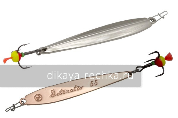Detonator - зимняя блесна уплощенной формы с небольшим килем-утяжелителем на верхнем конце. На спуске она красиво планирует, создавая ощутимые вибрации, собирая хищника со значительных расстояний. Если поменять местами карабин для крепления лески и тройник, характер игры приманки поменяется: игра станет более размашистой, и колебаться блесна станет сильнее. Эта блесна - отличный поисковый инструмент для активного окуня в условиях стоячей воды.