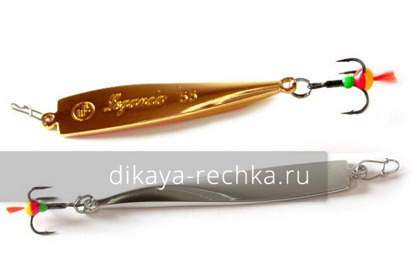 Legenda - зимняя блесна в виде почти плоского вытянутого треугольника с лёгким S-образным изгибом в плоскости и утолщением особой формы внизу, в узкой части. Её назначение - ловля окуня в стоячей воде и на слабом течении. При подбросе удилищем блесна резко уходит вбок, натягивая леску, затем планирует вниз по дуге, покачиваясь из стороны в сторону как раненая рыбка. Использование вертлюга для крепления приманки к леске вполне допустимо, но он не должен быть большим, иначе вы нарушите баланс, и блесна начнёт заваливаться, сбиваясь с игры.