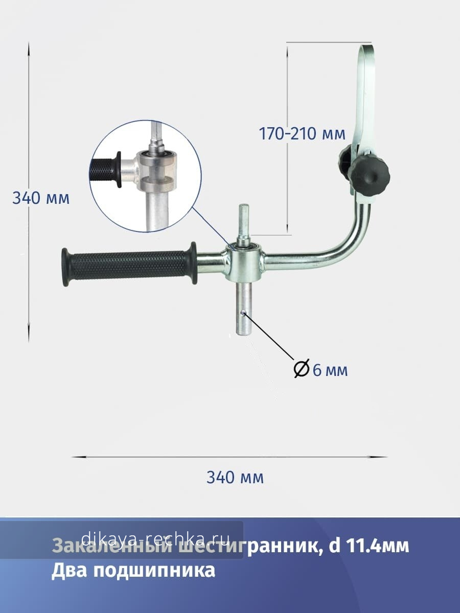 Шестигранный хвостовик 11,4 мм выполнен из закаленной стали, выходной вал диаметром 20 мм совместим со шнеками Тонар Electroshtorm, Motoshtorm и имеет два отверстия под винт диаметром 6 и 8мм.