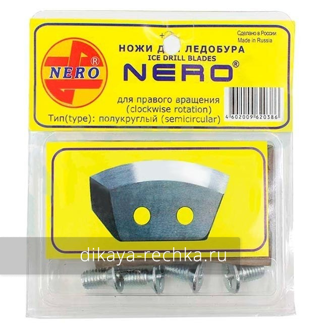 Запасной комплект ножей для шнеков Nero правого вращения, предназначенных для использования с шуруповёртом. Ножи изготовлены из конструкционной рессорно-пружинной стали марки 65Г, имеющей высокую вязкость, поэтому они хорошо переносят ударные нагрузки, часто возникающие при сверлении неоднородного льда. Благодаря полукруглой форме режущей кромки их можно использовать при бурении любого льда - сухого, промороженного, грязного, мокрого. Ножи упакованы в прозрачный блистер, в комплекте с ними идут крепёжные винты. Обращаем ваше внимание на то, что хотя эти ножи по расстоянию между отверстиями подходят для большинства отечественных ледобуров соответствующего диаметра, использовать их с ледобурами левого вращения нельзя.