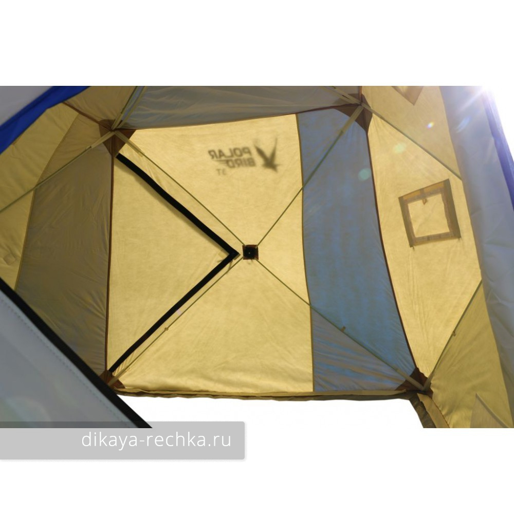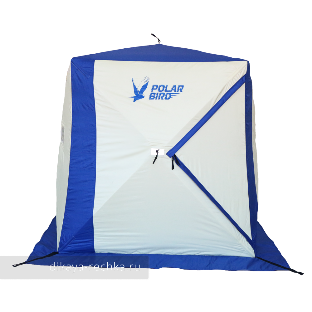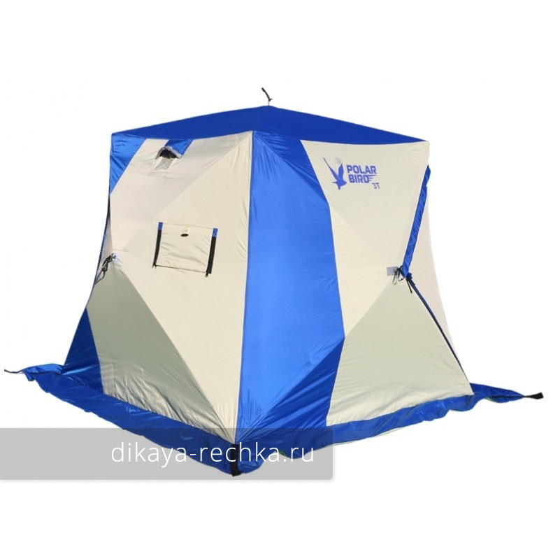 Палатка "Polar Bird 3Т" - утеплённая синтепоном с плотностью 150 г/м² складная двухместная зимняя палатка типа "куб" с двумя выходами. Быстрая разборка и сборка, высокая ветроустойчивость и прочность, компактность при транспортировке, отличная вентиляция, прекрасное сбережение тепла и наличие двух карманов для снаряжения и двух сетчатых полок делают эту палатку прекрасным выбором для любителей рыбачить зимой с комфортом. Размер низа 200 на 200 см, высота 180 см. Палатка имеет две внутренние юбки, оснащённые лентой велкро ("липучкой"), между которыми можно пристегнуть тёплый пол для ещё большего комфорта на зимней рыбалке (пол поставляется отдельно). Отсутствие сквозной термостежки и объем синтепонового утеплителя помогают сохранить тепло в самых жёстких условиях. Продуманная система вентиляции с отстёгивающимися клапанами позволяет использовать газовый и дровяной обогрев без опасности угореть. Каркас изготовлен из высокопрочного стеклокомпозитного прутка. В комплекте с палаткой идут транспортировочный чехол и комплект оттяжек.