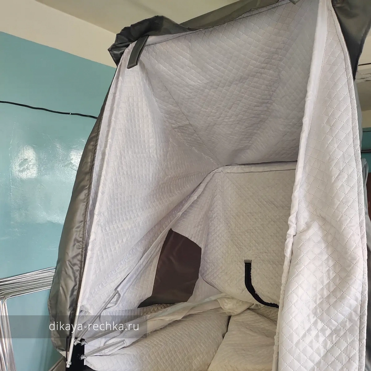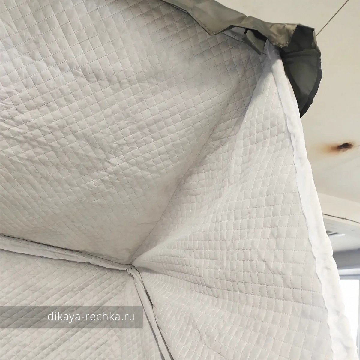 Утепленный тент палатки выполнен из плотной ткани с водоотталкивающей пропиткой, имеет стропы для крепления ко льду и дополнительное усиление на углах каркаса.
