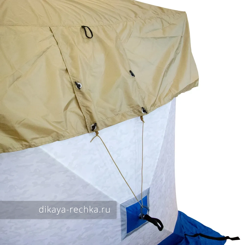 Накидка на зимнюю палатку для дополнительной защиты от осадков сшита из водоотталкивающей ткани Taffeta T190 PU2000 с проклейкой швов. Крепится к хабам палатки, клапан на одной из сторон в средней части открывается при необходимости вывести печную трубу.