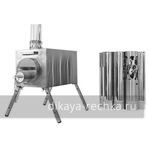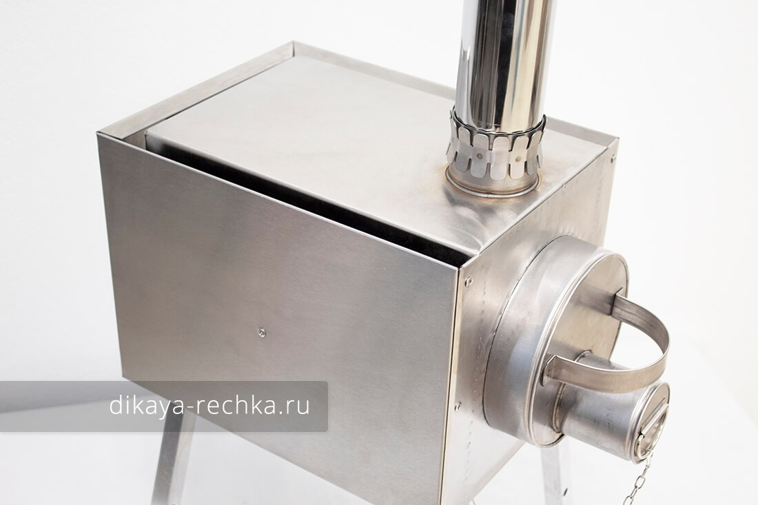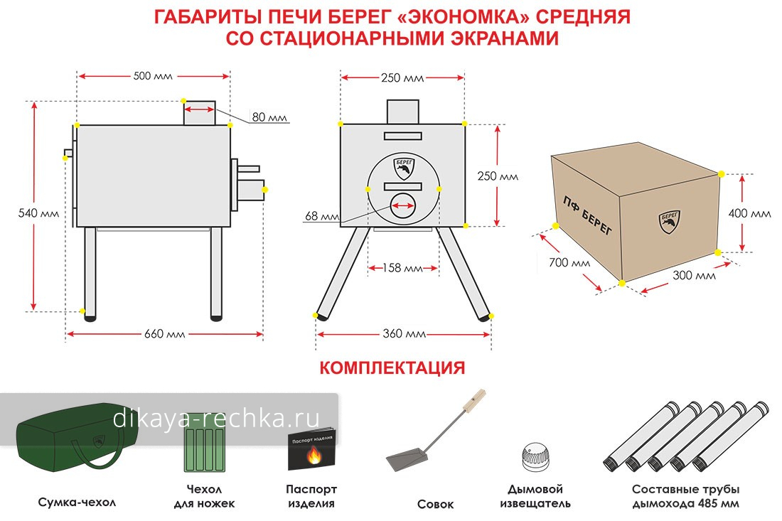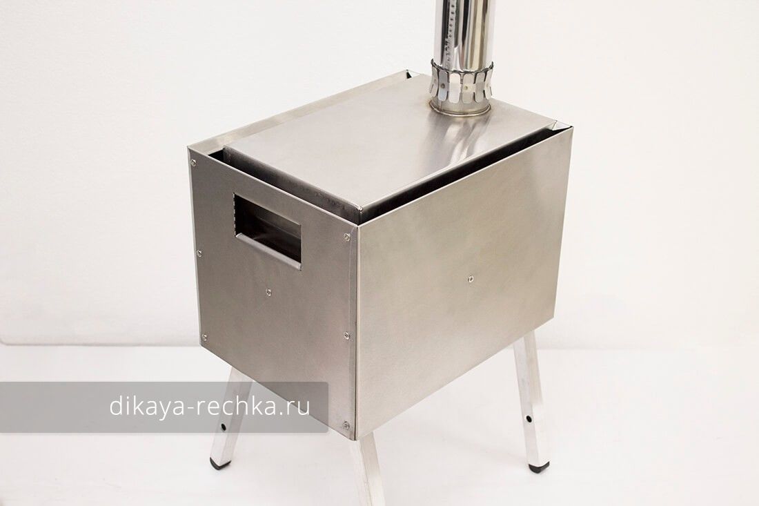 Мобильная печь длительного горения, предназначенная для отопления зимних палаток и приготовления пищи в полевых условиях. Она изготовлена из жаропрочной нержавеющей стали марки AISI 430 толщиной 0,8 мм. Такая толщина обеспечивает оптимальное соотношение между весом изделия и длительностью эксплуатации без прогорания. В печах "Экономка" есть экран-искрогаситель, образующий камеру дожигания. Такая конструкция повышает пожаробезопасность и эффективность работы, так как пламя не вылетает в трубу напрямую и лучше прогревает верхнюю поверхность печи. Печь оборудована несъёмными экранами, по бокам, сзади и снизу, которые защищают от от соприкосновения с раскалённой поверхностью и обеспечивают конвекционный поток воздуха вдоль корпуса печки для лучшего прогрева палатки. Также стационарные экраны служат дополнительными рёбрами жёсткости. Внутри топочной камеры, в нижней её части, установлены две пластины под углом 45 градусов, которые позволяют топливу при прогорании смещаться к центру, а также служат дополнительными рёбрами жёсткости. Дверца топки съёмная, круглой формы, на ней есть ручка и поддувало со стаканом, который регулирует приток воздуха к топливу. Дно печки надёжно проварено аргоновой сваркой. Эти печи комплектуются прочными съёмными ножками из алюминия, крепящимися с помощью винтов с барашком. В комплекте с печкой поставляется прочная сумка для переноски, сшитая из ткани "Оксфорд", а также 5 прямых колен трубы дымохода. Стыки колен направлены вверх, поэтому даже при отапливании RUF брикетами в режиме тления не сгоревшая связующая смола не течёт по дымоходу снаружи.