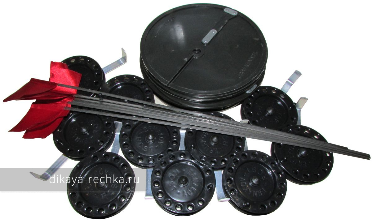 Комплект из 10 не оснащённых зимних жерлиц в сумке из непромокаемой ткани для удобства хранения и транспортировки. Комплектация каждой жерлицы - катушка увеличенного диаметра 90 мм, металлический держатель катушки, круглая подставка диаметром 200 мм и флажок.